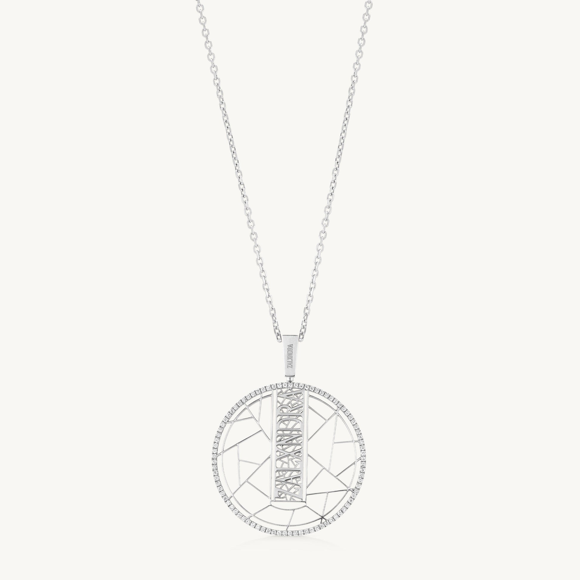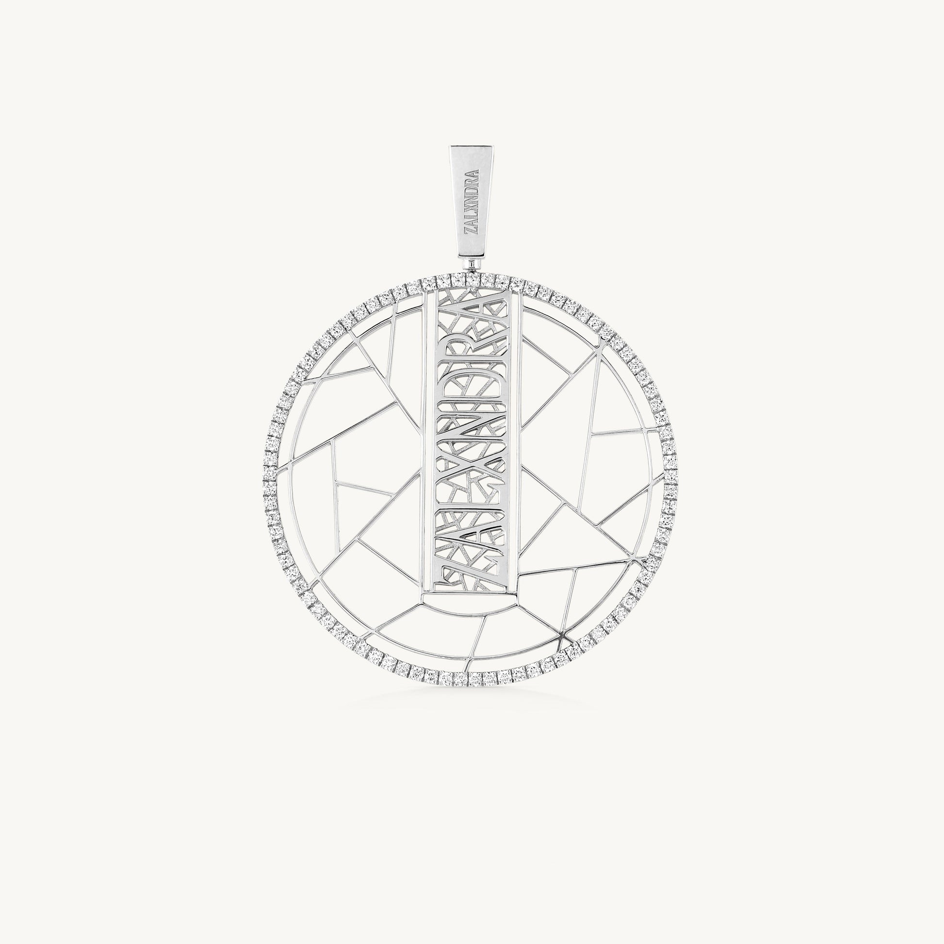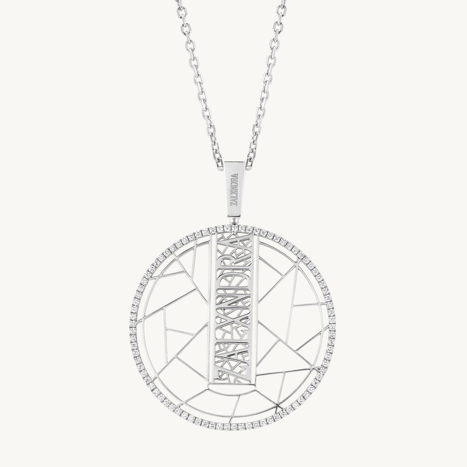 Elevate your elegance with ZALXNDRA’s distinguished EZY LVR Collection. This refined pendant necklace is masterfully crafted in luminous 18k white gold and features a bold 45 mm medallion set with 85 brilliant-cut G/VS diamonds totaling 1.03 carats. Suspended from an 80 cm chain, this piece radiates contemporary sophistication and timeless prestige.