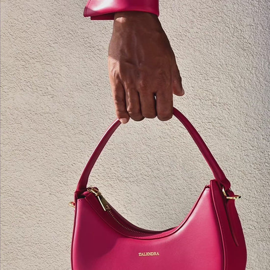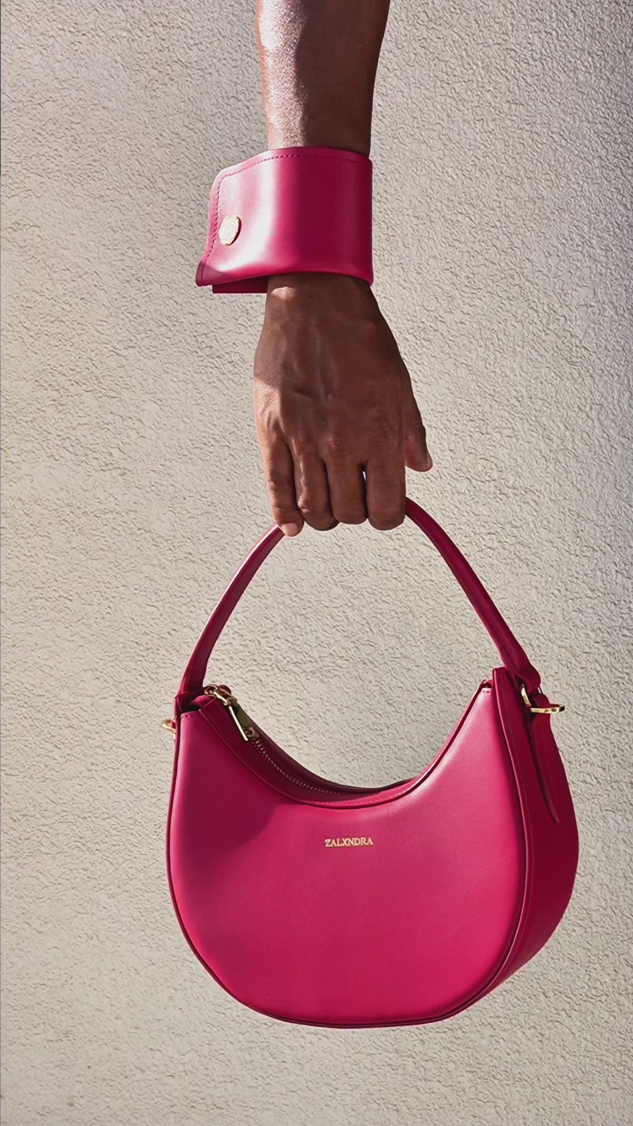 Minimalist in shape, maximal in attitude. The EZY LVR Curved Half Moon Bag in Raspberry Pink is cut from smooth calf leather and detailed with a gold-stamped ZALXNDRA logo. Finished with gold-tone hardware and an adjustable shoulder strap, this compact icon radiates energy and elegance in equal measure.