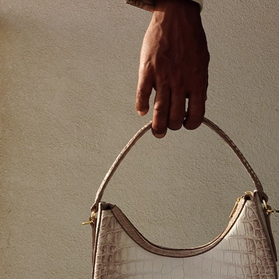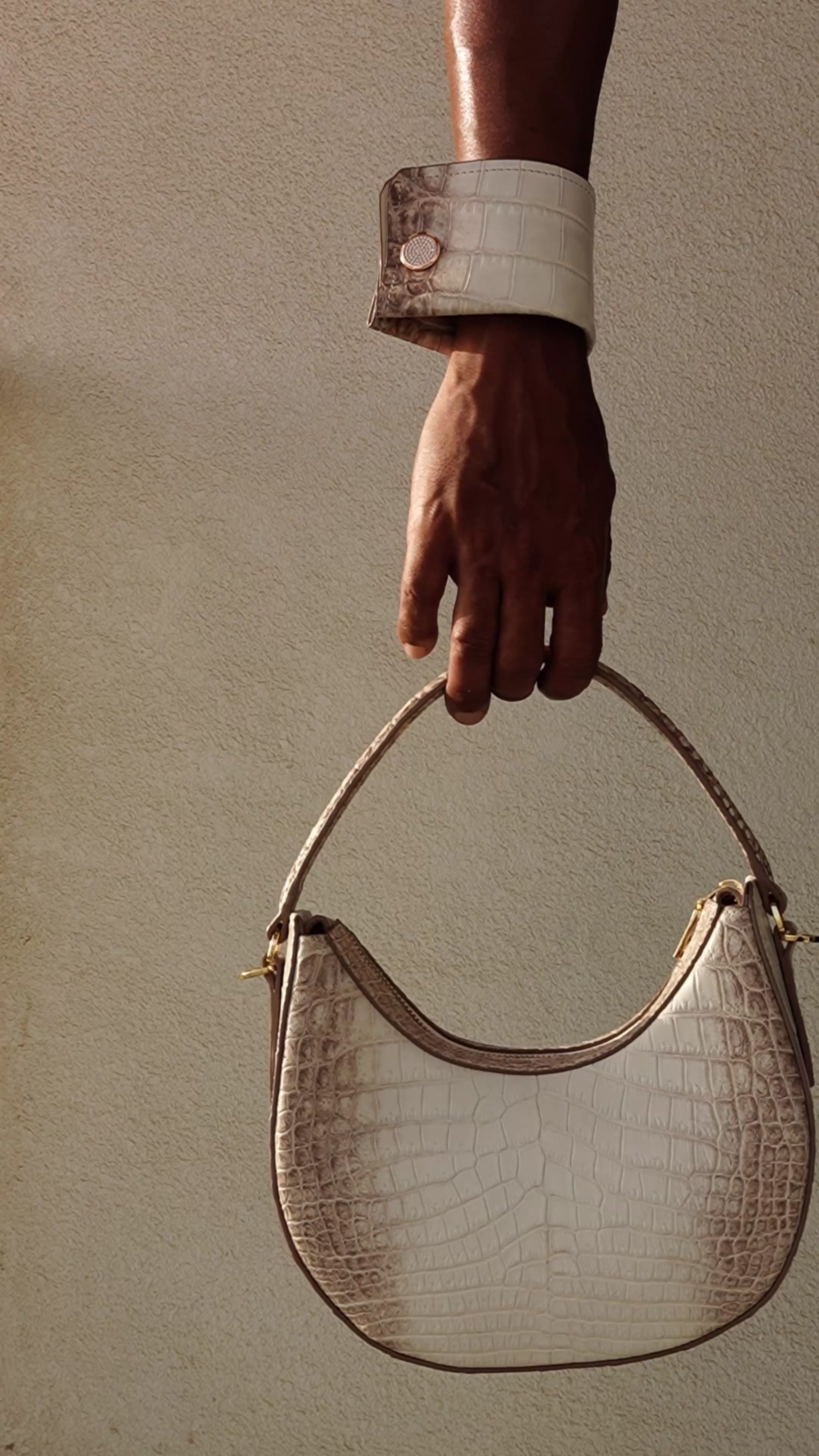 Timelessly sculpted and crafted in rare exotic Himalayan leather, the EZY LVR Curved Half Moon Bag embodies quiet luxury with an edge. Its gracefully arched silhouette is finished with gold-tone hardware, a structured top handle, and a detachable shoulder strap for versatile styling. An icon of refined restraint and enduring craftsmanship.