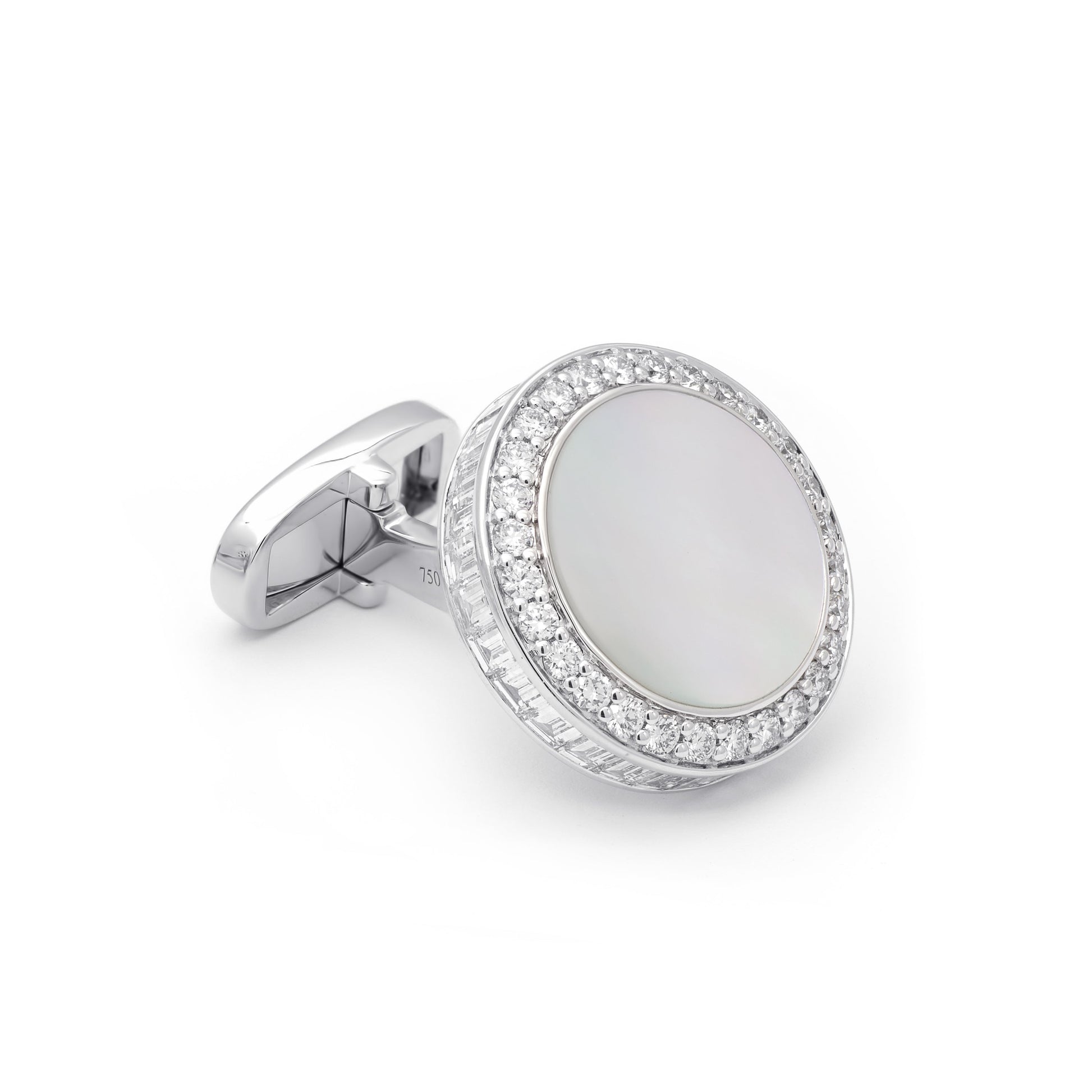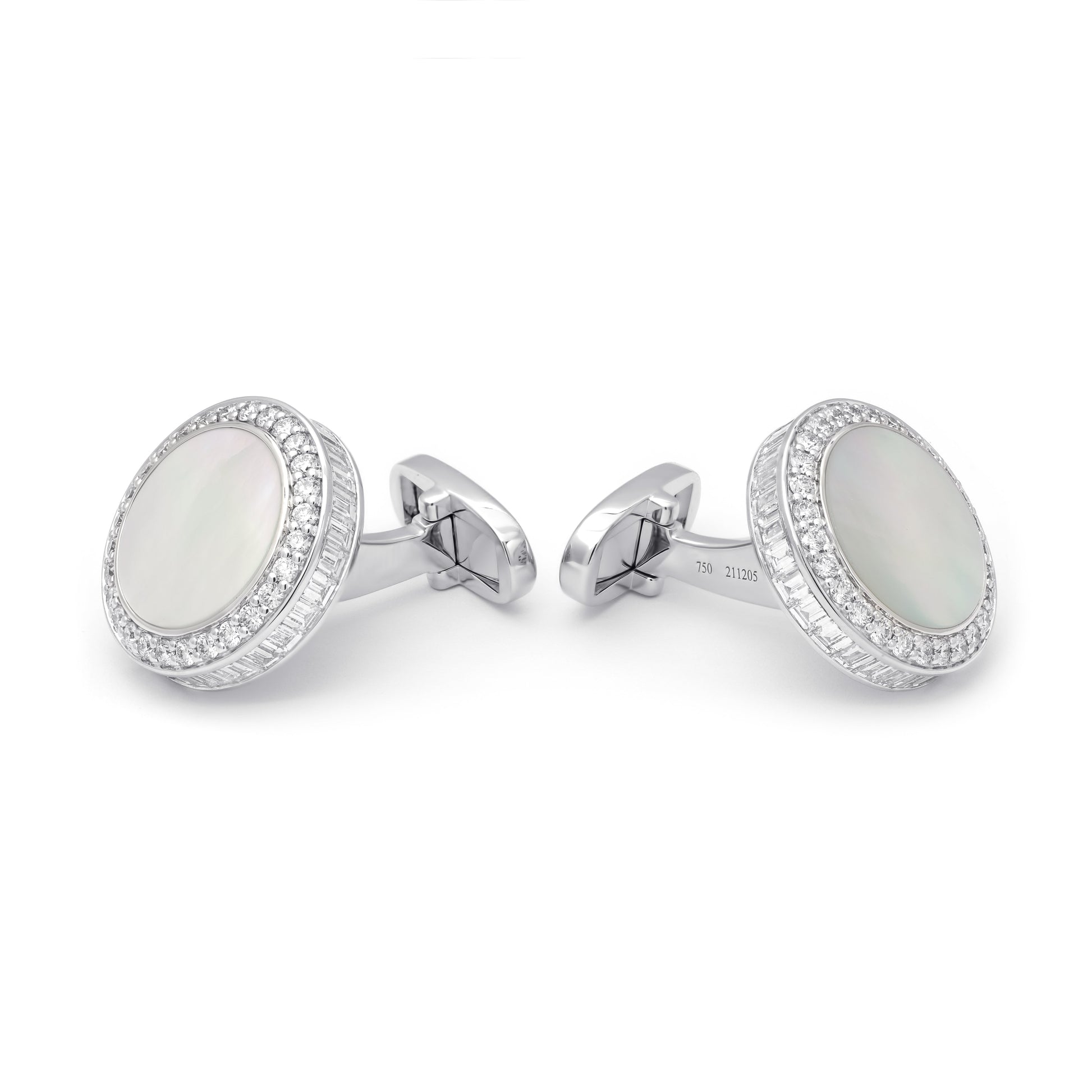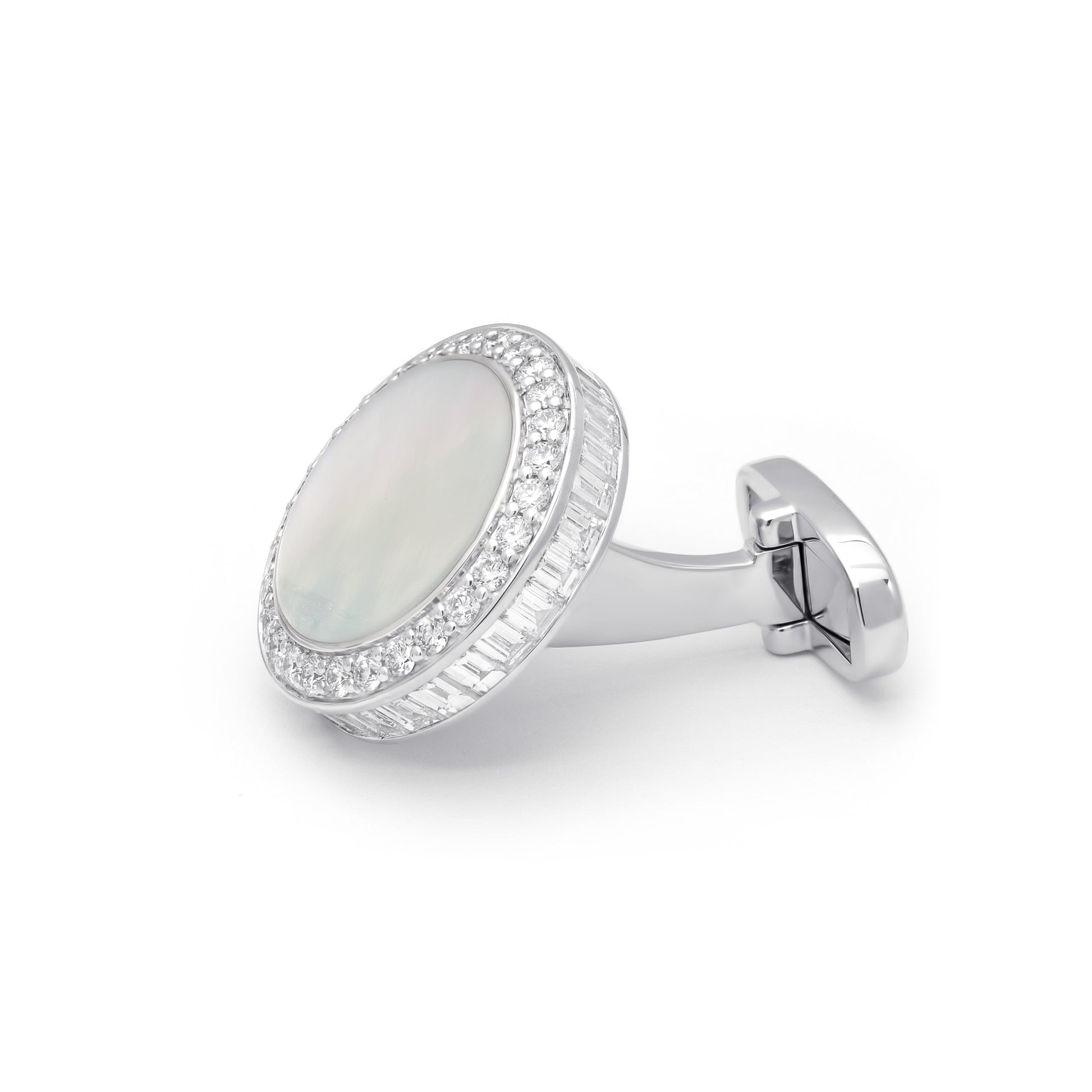 White Gold Cufflinks with Baguette and Brilliant Diamonds Framing White Mother-of-Pearl
