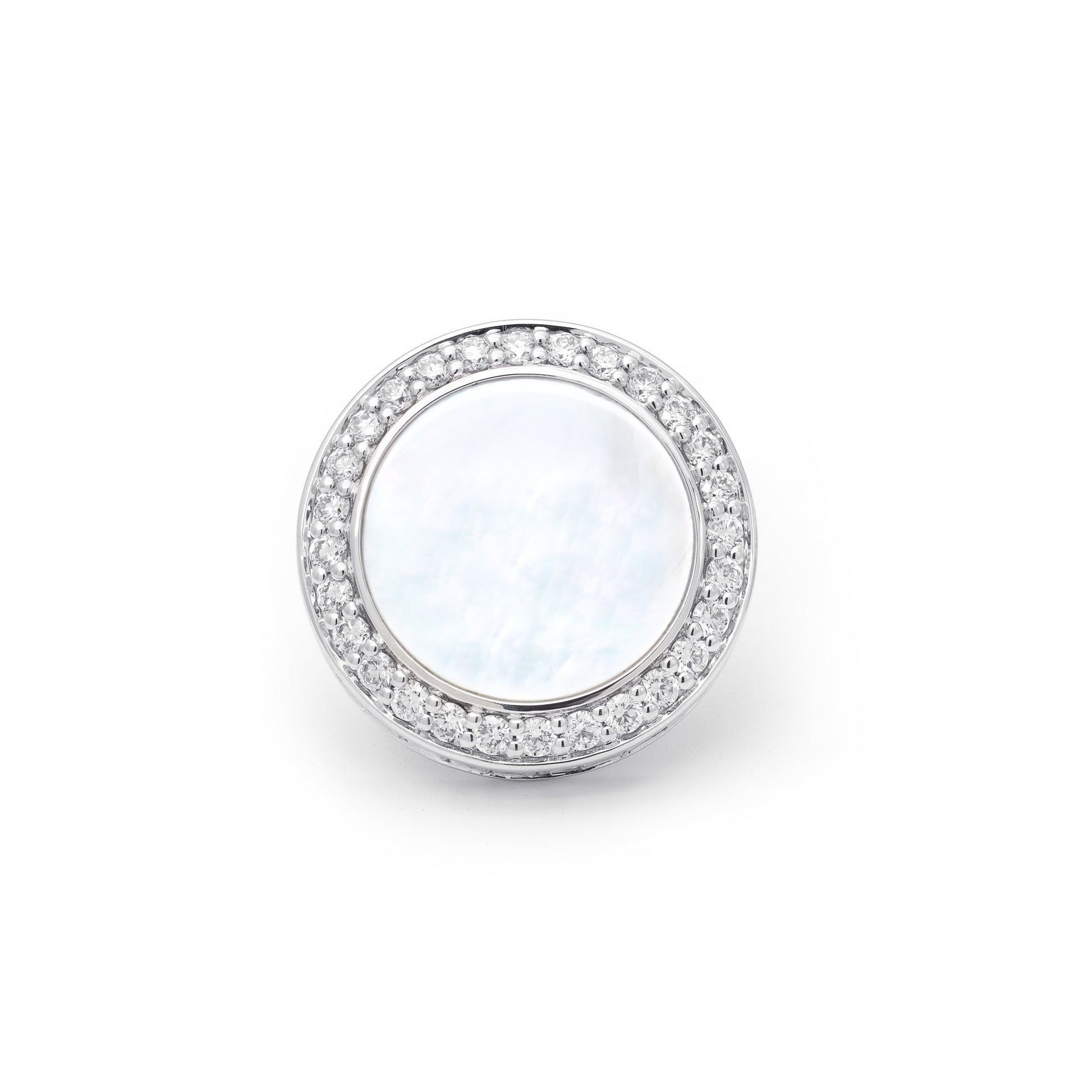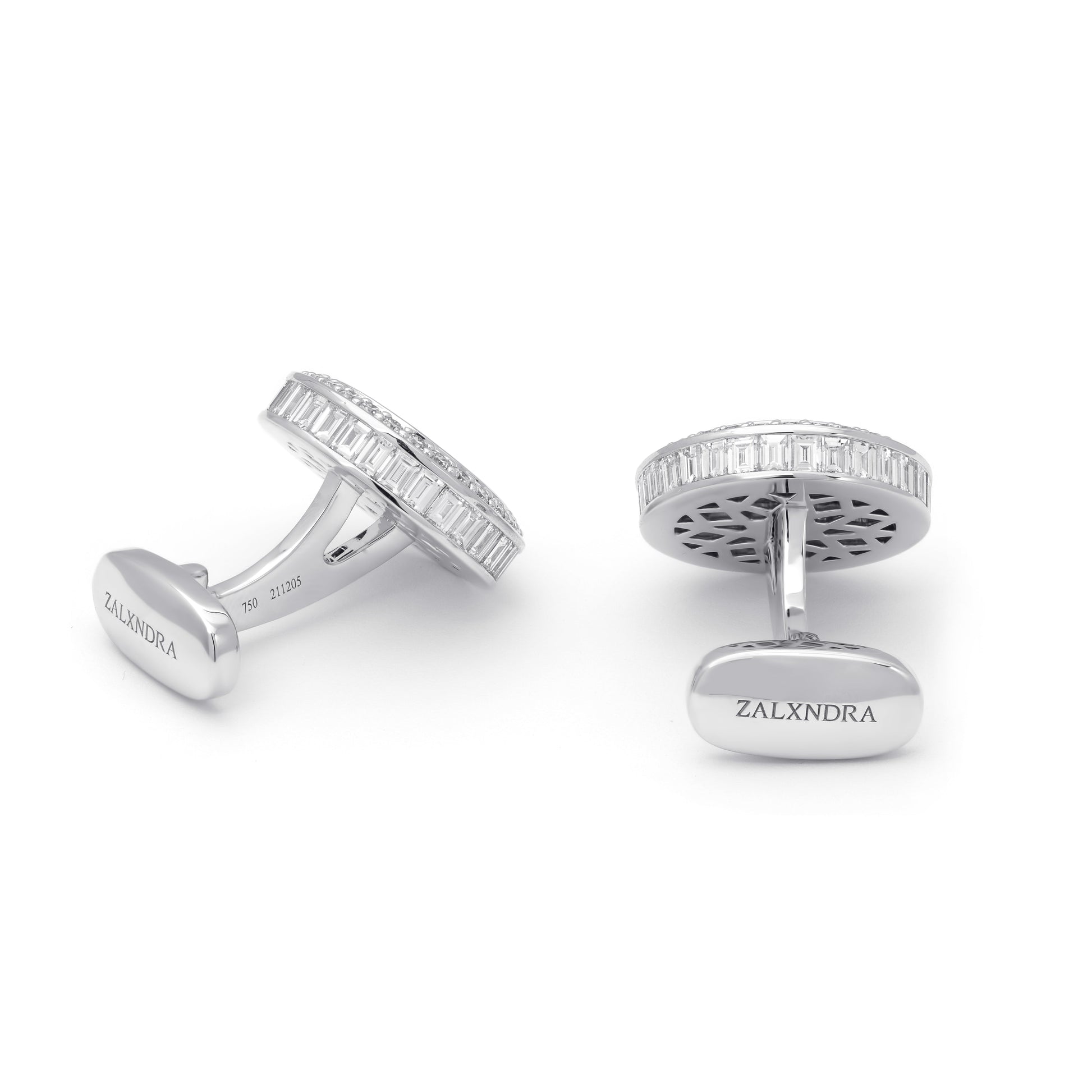 The noble counterpart to the ZALX RING — MOTHER OF PEARL CROWN. These cufflinks feature radiant white mother-of-pearl cabochons, encircled in twin halos of baguette and brilliant-cut diamonds. The interplay of texture and light, soft and sharp, elevates this piece into quiet statement territory — modern, sculpted, and meticulously finished in 18k white gold.