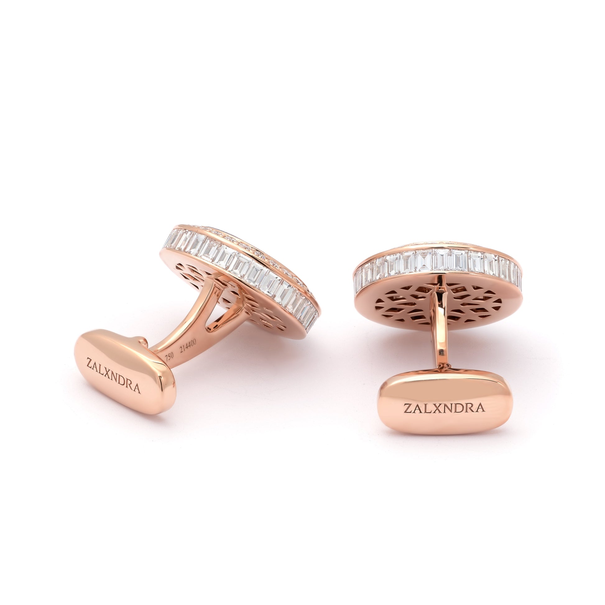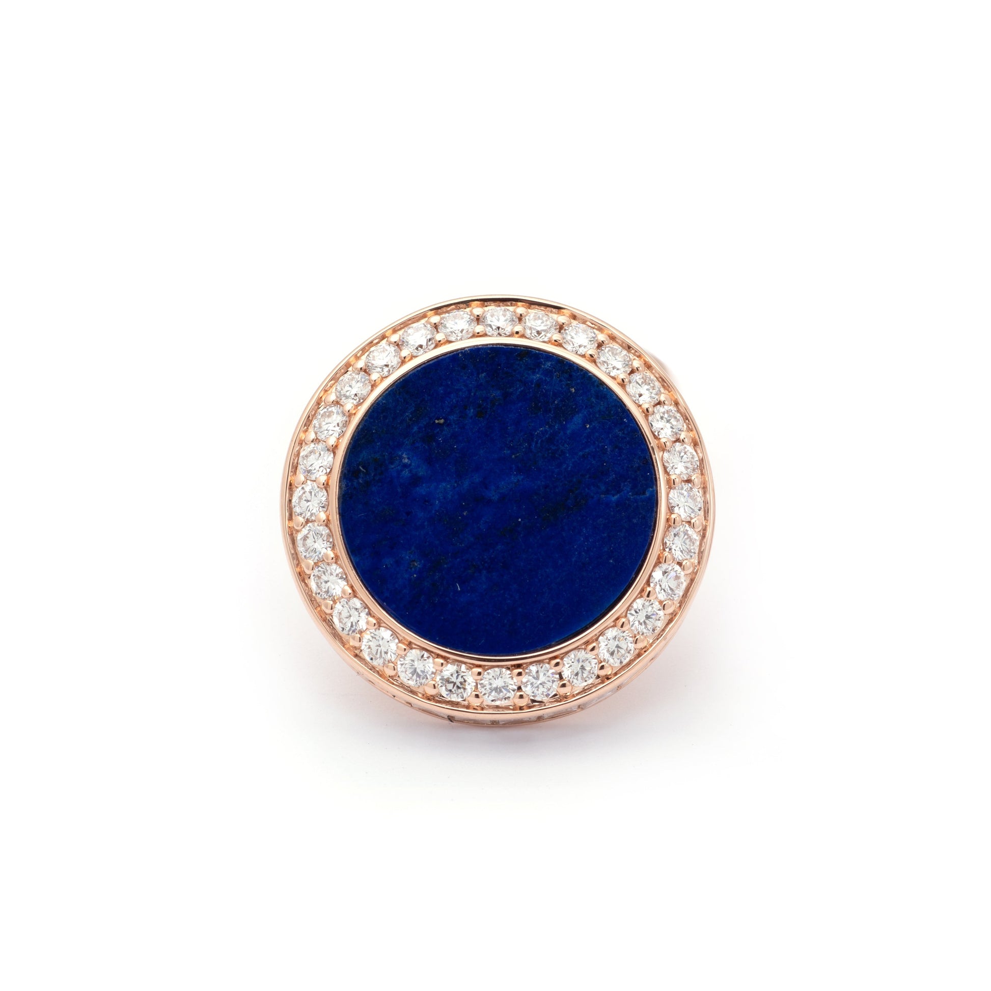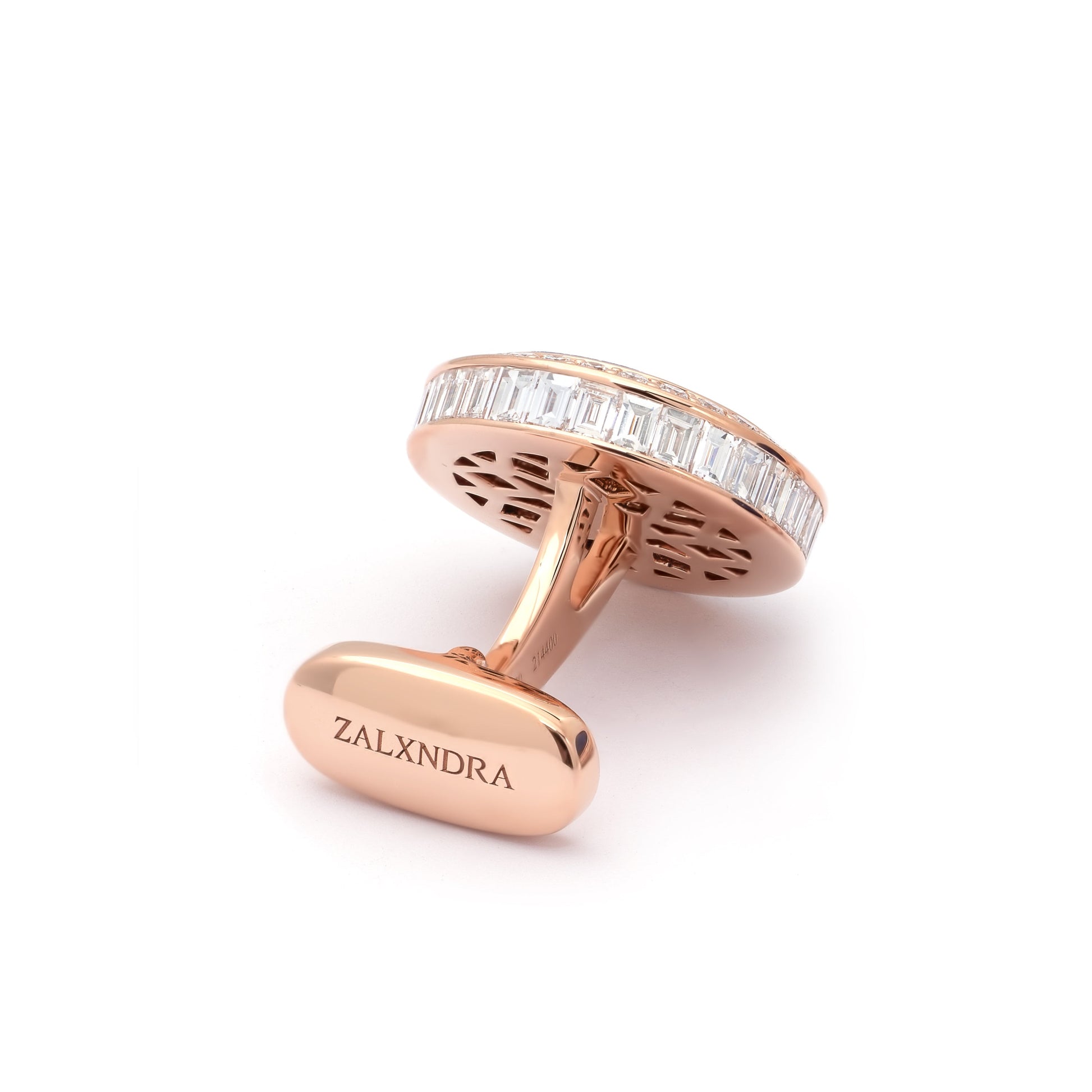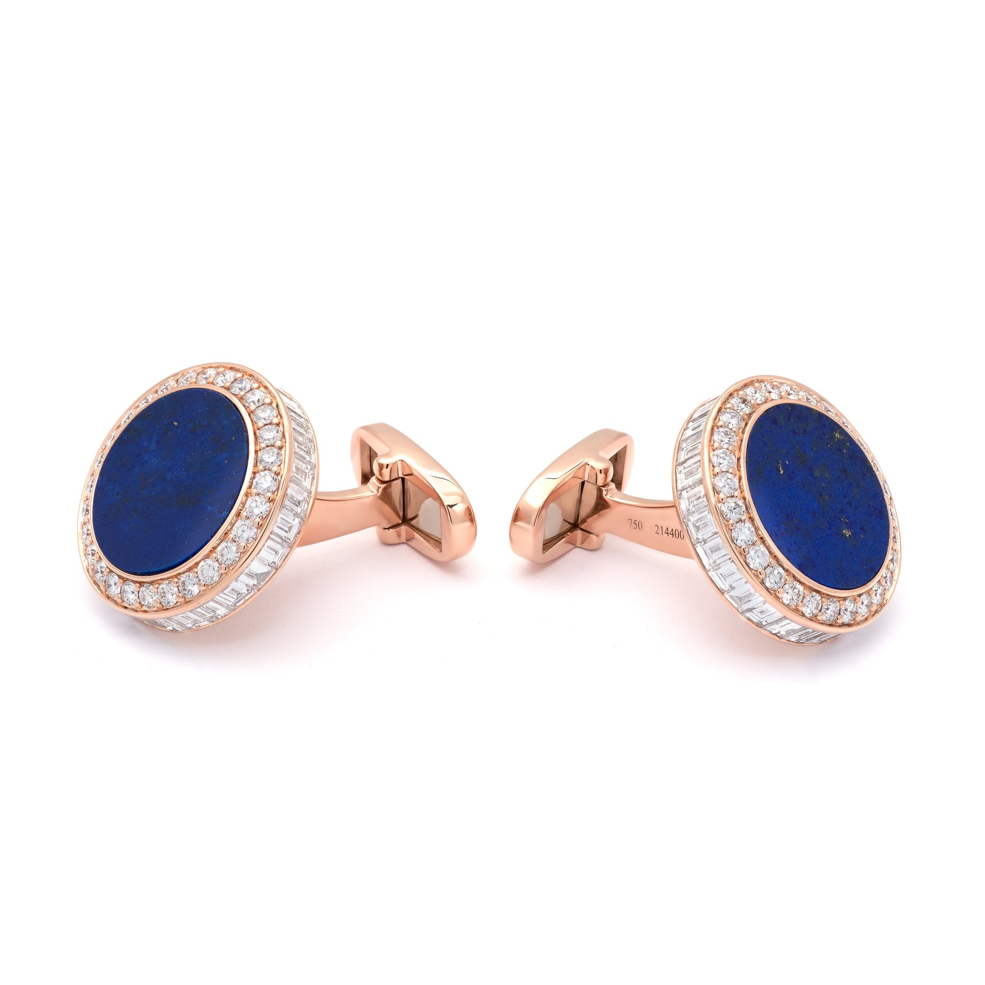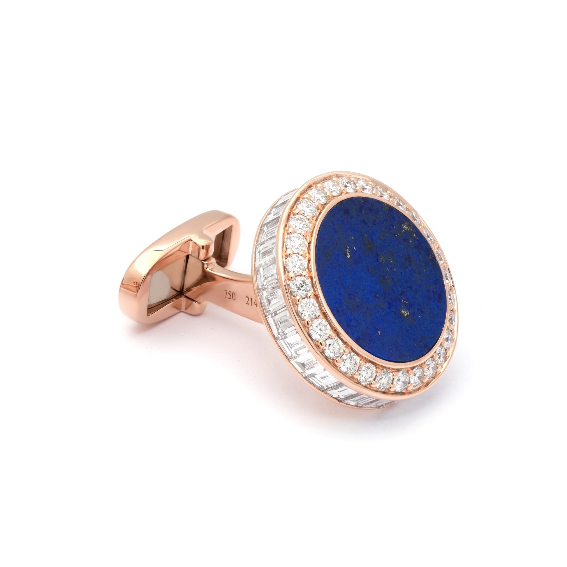 LAPIS CROWN cufflinks are the companion to the ZALX ring of the same name — each piece crafted in 18k rose gold and set with a vivid 18mm round lapis lazuli center. Surrounding the stone, a double halo of diamonds brings symmetry and radiance: 56 round brilliant diamonds (0.90 ct) encircle the face, while 60 hand-set baguette-cut diamonds (3.20 ct) form a sculpted outer wall along the sides.