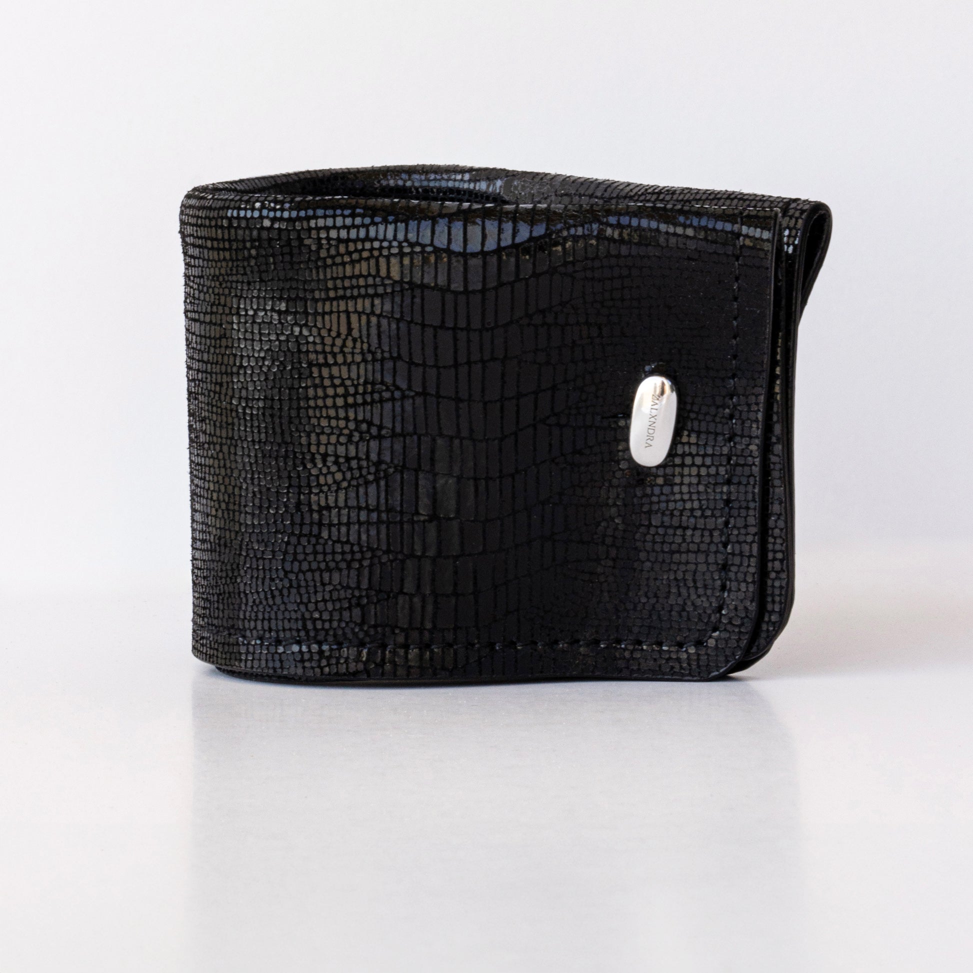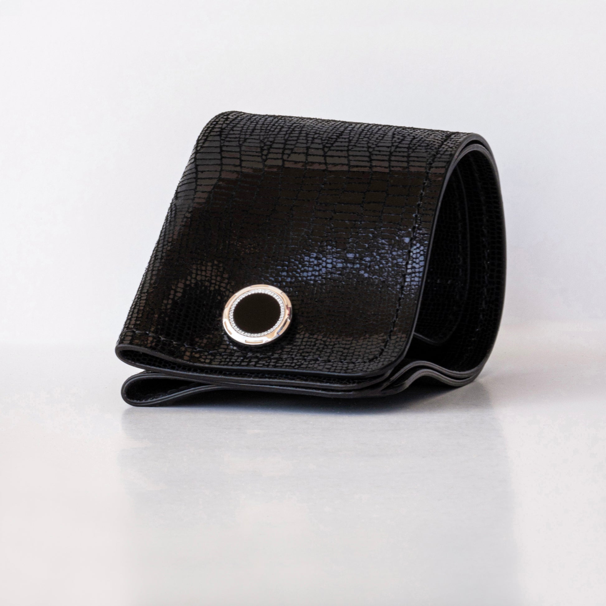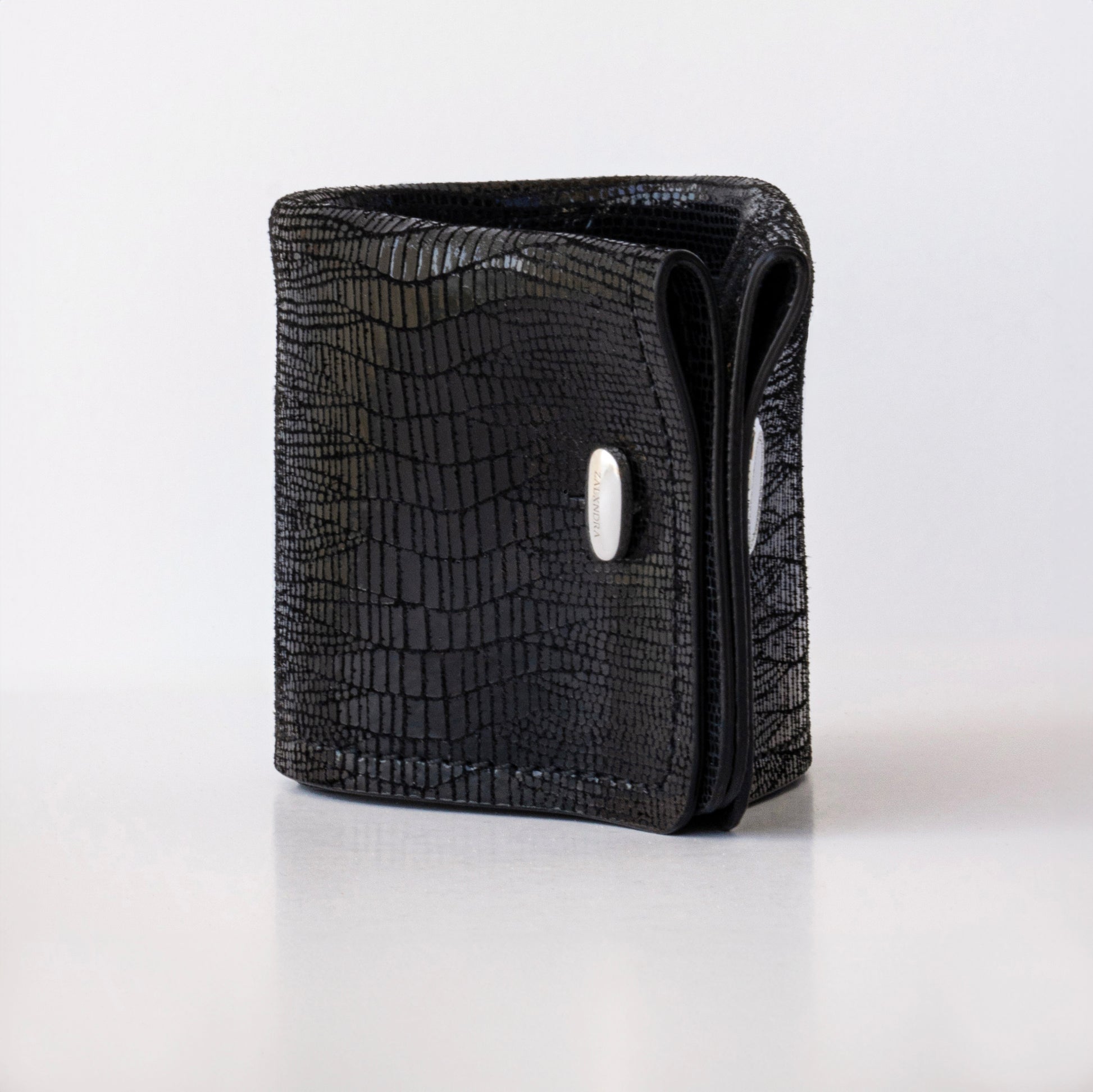 NOIR LAQUÉ is the boldest finish in the ZALX: LE VALEUR series — a high-gloss, lizard-embossed leather that plays with texture and light. Its surface carries a mirror-like lacquered shine, while the geometric skin pattern adds depth and tension.