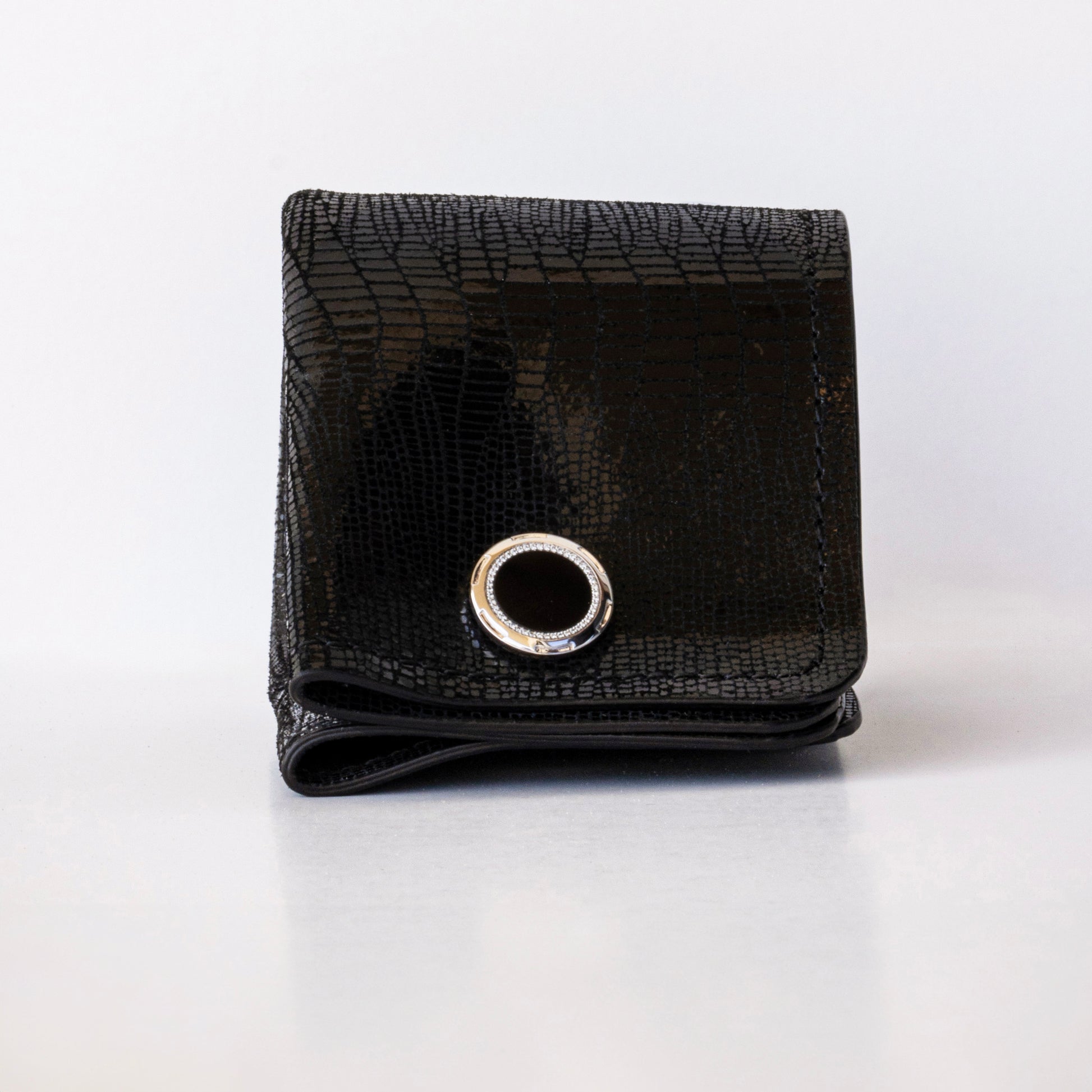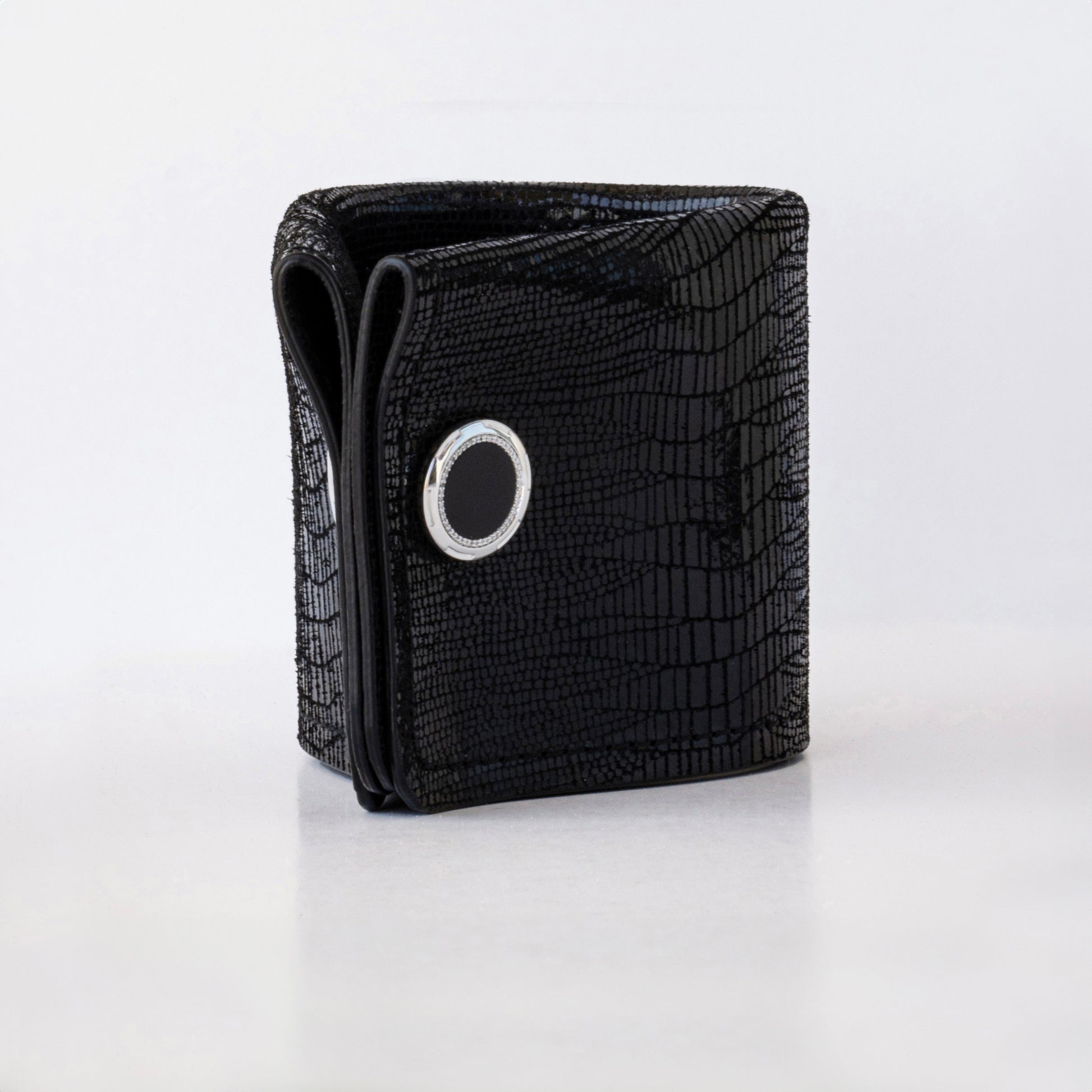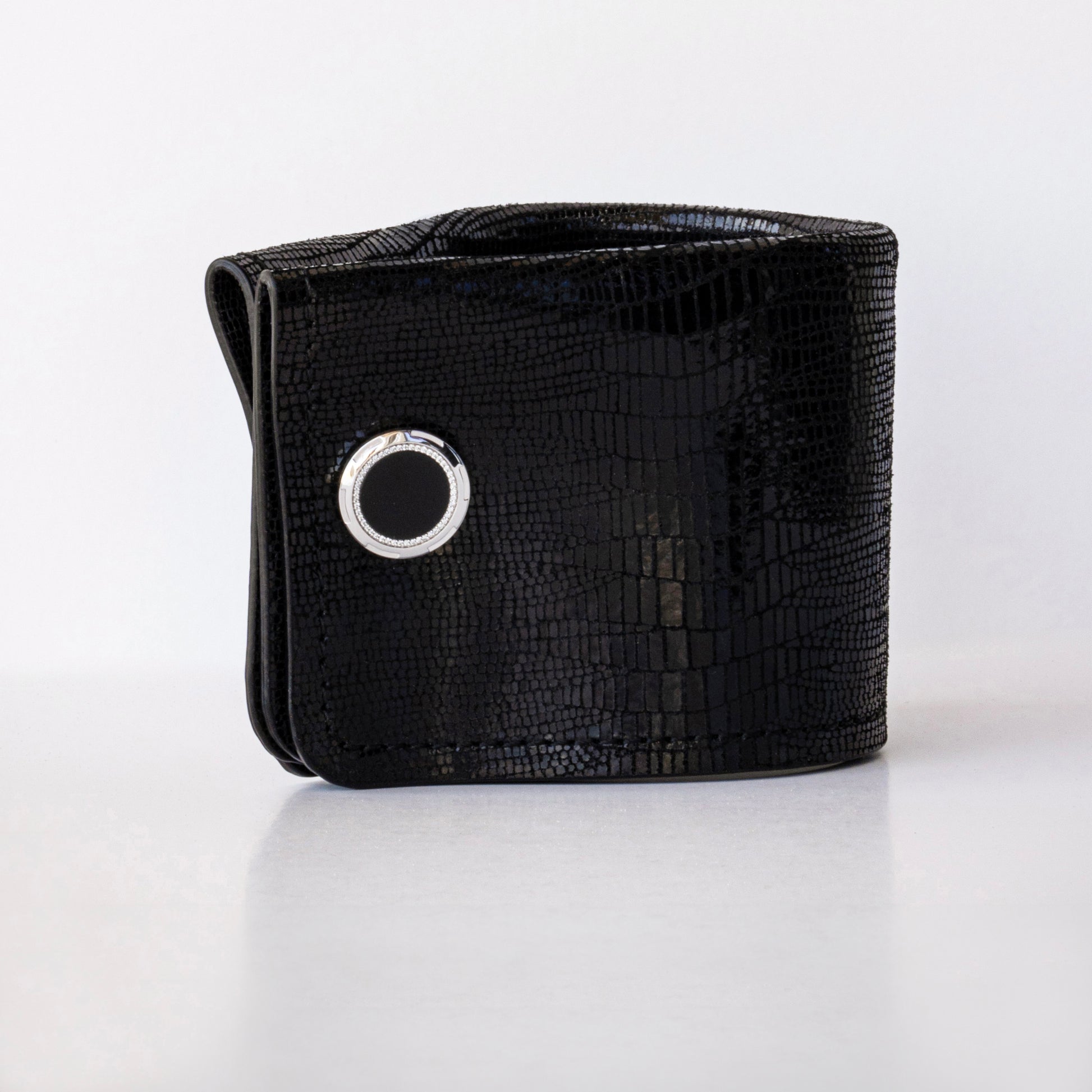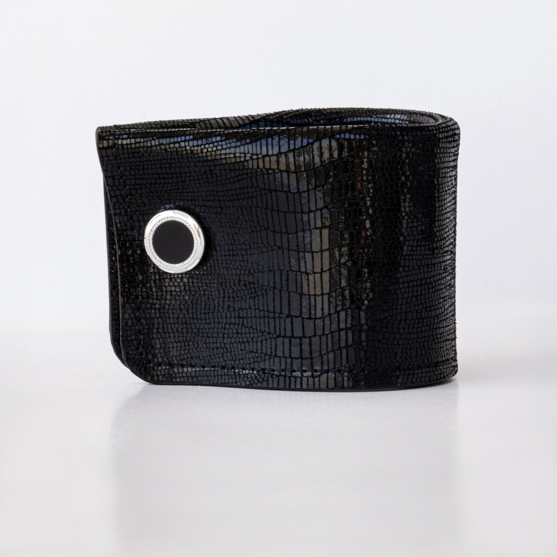 NOIR LAQUÉ is the boldest finish in the ZALX: LE VALEUR series — a high-gloss, lizard-embossed leather that plays with texture and light. Its surface carries a mirror-like lacquered shine, while the geometric skin pattern adds depth and tension.