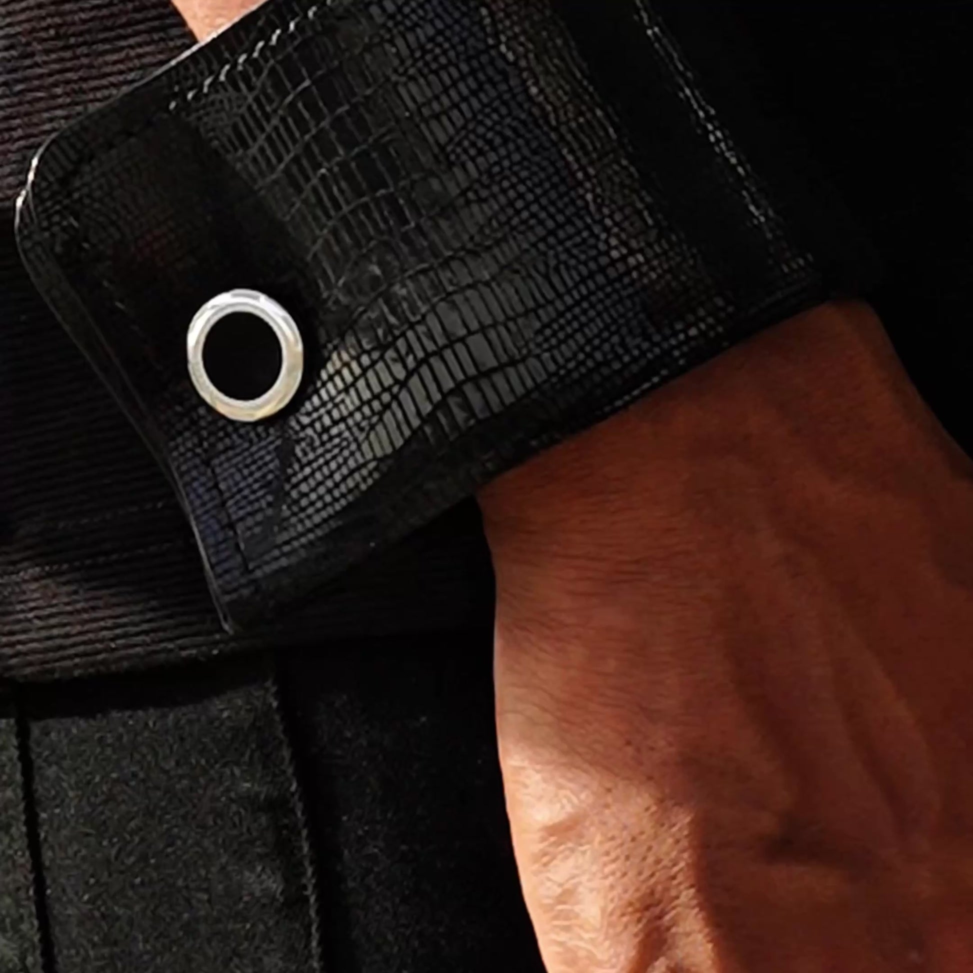The interior structure remains true to the collection: a patent-pending internal form sculpted to hold without collapse, anchored by our modular cufflink system. The silhouette is architectural; the surface, almost serpentine.
